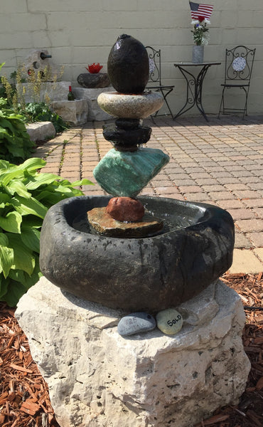 Sold 2018 Small Stone Fountain set atop Limestone Pedestal boulder, self contained, 70 gph pump within hand carved Granite Basin. Composition stone various Granite, field stone. Overall Height approximately 36" tall, fountain 110 lbs, pedestal boulder 300+ lbs.