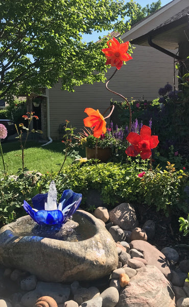 Sold 2016 Medium Stone-Glass Flower Fountain. This fountain was a collaboration between myself and a talented Glass Artist (Trish Gardiner) Trish created the Blue-White glass flower that rises up from the large hand carved granite boulder. The entire composition sits atop a 35 gallon 32" diameter in-ground basin. The design of the flower-boulder pool stone and the basin allow this fountain to push a large volume of water with very little water lost to splashing outside the recovery area. Fountain is lite with a LED light ring just below the glass flower composition. The glass flowers on copper stems within the landscape of this photo were also created by Trish Gardiner. Original artwork water-feature