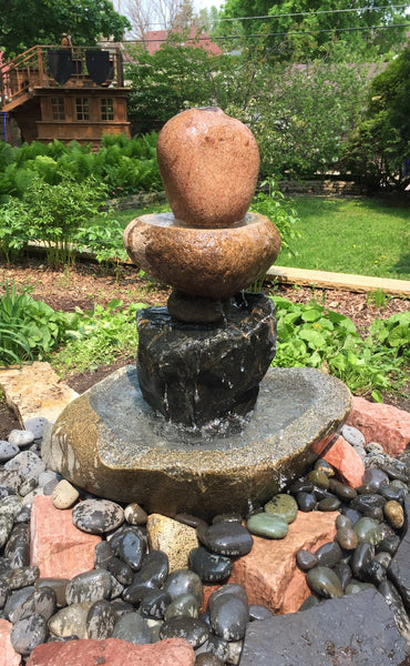 Sold 2017 Large Stone Fountain. Granite, 40" tall, 600+ lbs, . Has 1050 GPH pump and 70 gallon 46" diameter in-ground basin. Accent cover stones are Black (cornflower blue) Mexican Beach Pebbles. Original Artwork.