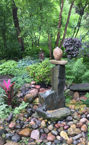 Sold 2013 Large Stone Fountain. Greenish Taconite and Granite stones make up this composition, 46" tall, 500+ lbs, . Has 1350 GPH pump with two fountain heads upper and lower. 70 gallon 46" diameter in-ground basin. Accent cover stones are Mexican Beach Pebble and various river stones. Original Artwork.