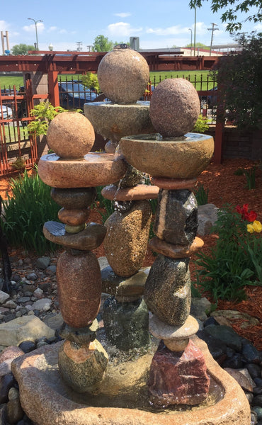 Sold 2019 Large Stone Fountain, composed of over 40 stones, three compositions rising upward from a large granite pool stone basin. Water flows from tallest composition to the next two, into the pool stone and overflows into the bellow ground basin. LED submersible color changing lights , 72" tall, 2000+ lbs, Has 1350 GPH pump and 250 gallon 72" diameter in-ground basin. Accent cover stones are Black (cornflower blue) Mexican Beach Pebbles and various river rock. Original Artwork.