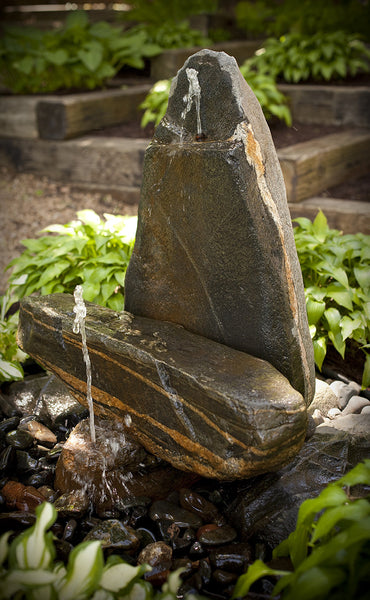 Sold 2011 Large Stone Fountain. Granite boulders unique shaped grey with light colored veins, 38" tall, 500+ lbs, . Has 1050 GPH pump with two fountain heads upper and lower. 70 gallon 46" diameter in-ground basin. Accent cover stones are Mexican Beach Pebble and various river stones. Original Artwork Water-Feature