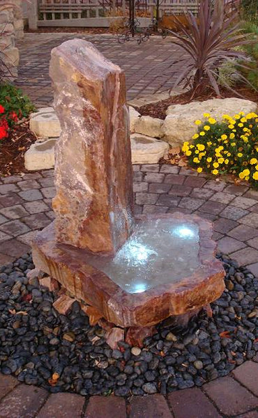 Sold 2014 Large Stone Fountain Purple Quartz 54" x 34" x 39". Has 1050 GPH pump and submersible LED lights. Fountain sits atop a 70 gallon 46" diameter in-ground basin. Accent cover stones are black-blue Mexican Beach Pebbles. Original Artwork Water-Feature.