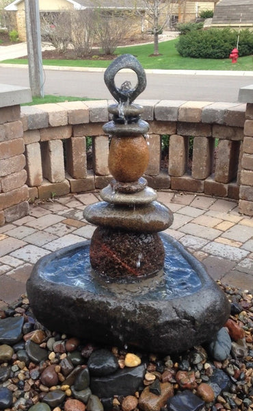 Sold 2013 Large Stone Fountain with hand carved Granite basin. Composition stones include a large rough textured dark Granite with a Red diagonal vein, followed by various Colorado flats, Orange Granite, and topped off by a Green-White Granite with a 3" horizontal core hole. This elegant looking fountain is a very unique blend of a traditional motif, natural stone, and contemporary top stone, 44" tall, 600+ lbs, . Has a 850 GPH pump and sits atop a octagonal shaped 100 gallon in-ground basin. Has 3-submersible LED lights within the lower pool stone basin. Accent cover stones are Black- Mexican Beach Pebbles. Original Artwork Water Feature.