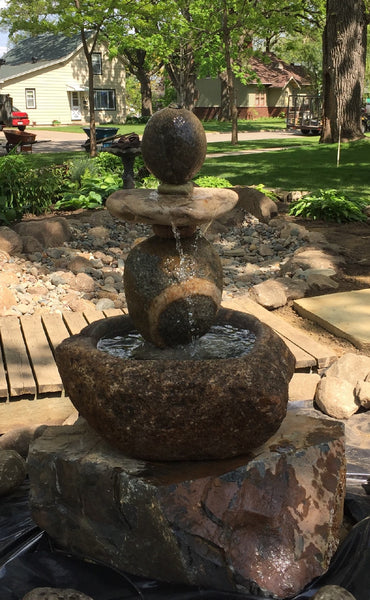Sold 2016 Medium Stone Fountain, self contained, 130 gph pump within hand carved Granite Basin. Middle oval shaped granite stone with raised circular vein. Composition stones are various Granite, basalt and field stone. Fountain set atop large Granite Pedestal boulder. Overall height 39", 600+ lbs. Original artwork water-feature. Lake City, MN