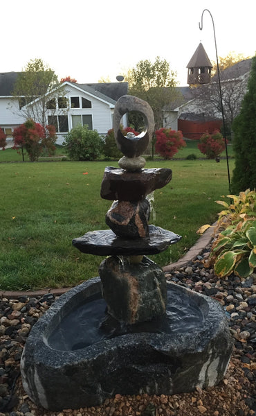 Sold 2017 Medium Stone Fountain, self contained, 130 gph pump within hand carved Granite Basin. Contemporary top stone with large horizontal core hole . Composition stones are various Granite, field stone. 34" tall, 200+ lbs. Original artwork.