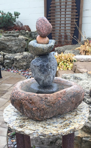 Sold 2019 Medium Stone Fountain, self contained, 130 gph pump within hand carved Granite Basin. Upper horizontal carved pool stone just below top stone. Fountain set atop Granite table. Composition stones are various Granite, fieldstone. 26" tall, 200+ lbs. Original artwork.