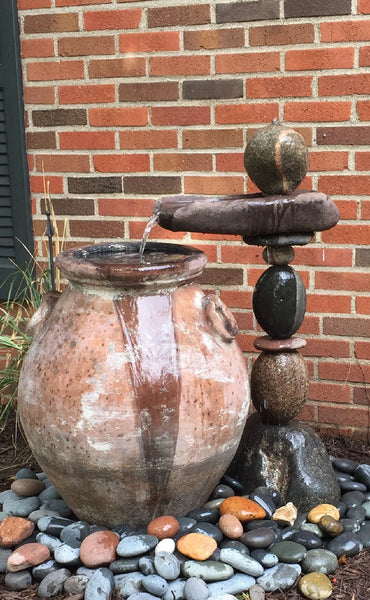Sold 2019 Unique Stone Fountain paired with clay vessel. Stone composition with horizontal pool stone pouring into clay vessel with false top and overflowing into basin within ground. Total height 40", 250+ lbs. Has 500 GPH pump. Fountain sits atop a 35 gallon 32" diameter in-ground basin. Accent cover stones are black and orange Mexican Beach Pebbles. Original Artwork. Water-Feature