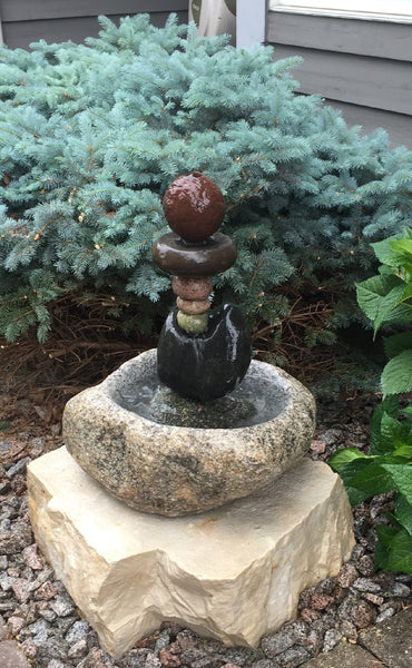 Sold 2019 Small Stone Fountain set atop Limestone Pedestal boulder, self contained, 70 gph pump within hand carved Granite Basin. Composition stone various Granite, field stone. Overall Height approximately 36" tall, fountain 110 lbs, pedestal boulder 300+ lbs.