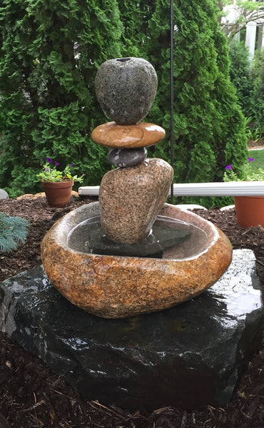 Sold 2018 Small Stone Fountain set atop Virginia Slate Pedestal Boulder, self contained, 70 gph pump within hand carved Granite Basin. Composition stone various Granite, fieldstone. Overall Height approximately 30" tall, fountain 110 lbs, pedestal boulder 300+ lbs.