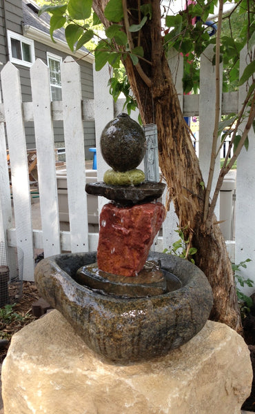 Sold 2013 Small Stone Fountain with vibrant colors, set atop Niagara Limestone Pedestal boulder, self contained, 70 gph pump within hand carved Granite Basin. Composition stones are various Granite, Purple Quartz, Jade Mexican Beach, and fieldstone. Overall Height approximately 36" tall, fountain 110 lbs, pedestal boulder 300+ lbs. Original Artwork Water Feature.