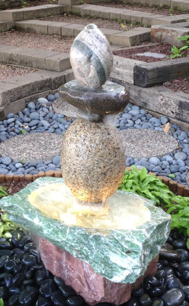Sold 2015       Large Stone Fountain.  Composition made up of very vivid colorful stones including, Purple Quartz, Wintergreen, Yellow Granite, and topped with and oval shaped Granite with a dark vein stripe.   45" tall, 600+ lbs,  Has 1050 GPH pump, LED submersible lights, and 70 gallon 46" diameter in-ground basin.   Accent cover stones are Black (cornflower blue) Mexican Beach Pebbles.  Original Artwork Water-Feature.