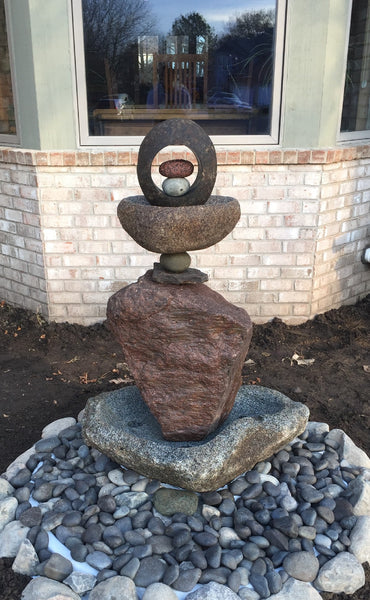 Sold 2019 Large Stone Fountain. Commissioned Unique Stone fountain with Granite hand carved pool stone and upper pool stone as well. Main vertical stone is a burgundy colored Granite stone horizontal texture. Top stone is a very round dark Granite with 6" horizontal core hole and two small oval accent stones within. Total height 48", 700+ lbs. Has 1350 GPH pump and submersible LED lights within pool stone basin. Fountain sits atop a 70 gallon 46" diameter in-ground basin. Accent cover stones are Black (cornflower blue) Mexican Beach Pebbles. Original Artwork. Water-Feature