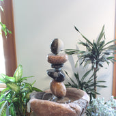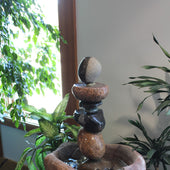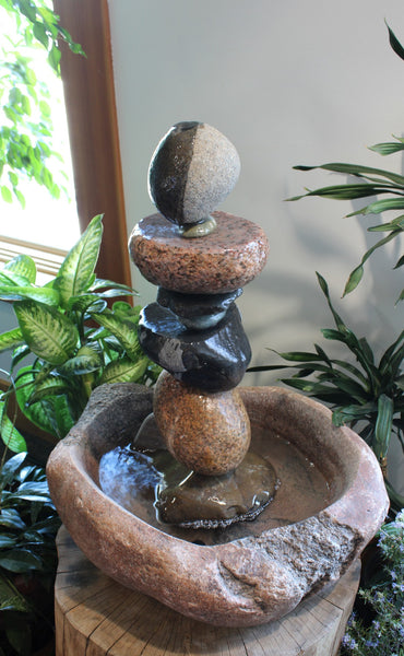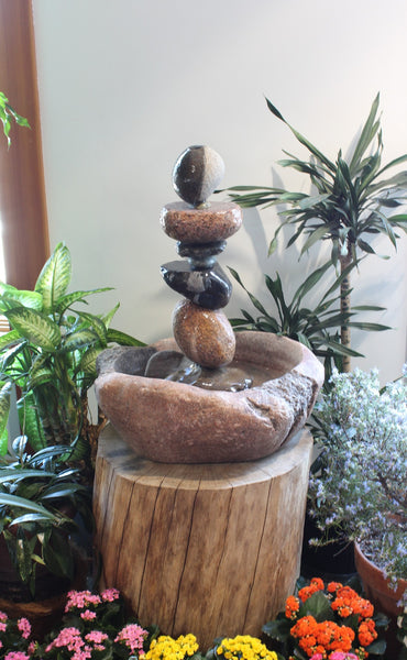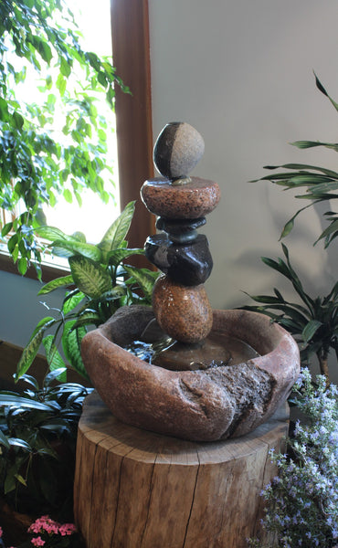 AVAILABLE FOR IMMEDIATE SALE, INSTALL-SETUP OR SHIPPING.     Price includes install-setup if within the Mpls/St. Paul and surrounding area.  If outside this area please call for a special shipping quote and coordination of install.  Custom Stone Fountain hand carved with pump for a complete working water feature.  This fountain flows water very evenly with very little splash outside the large basin, thus a good option for landscape, deck, patio, or indoor setting.  Fountain is 29" tall and weighs a total of 245 lbs.  Basin and composition stones are various Granite, Basalt, Gneiss, and Gabbro.  This fountain can be viewed in person at the University of Minnesota Landscape Arboretum 2026 Spring Flower Show in Chaska MN, through March 16th 2026.  Contact us for purchase details.